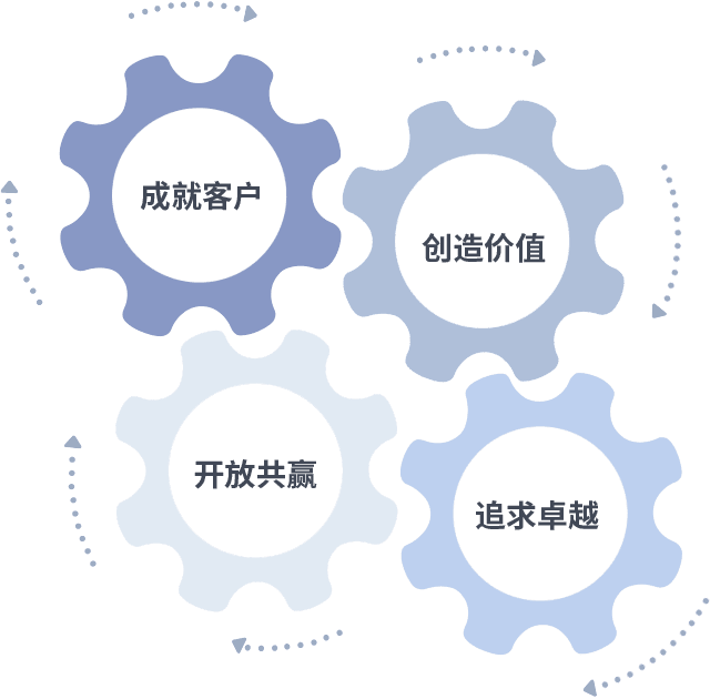 成就客户是一切决策的出发点,,,创造价值是衡量所有工作的标准,,,,追求卓越是我们做事做人的态度,,,,开放共赢是我们的格局也是最终的结果。。。价值观的齿轮环环相扣,,推动着组织里的每个人不断向前。。。
