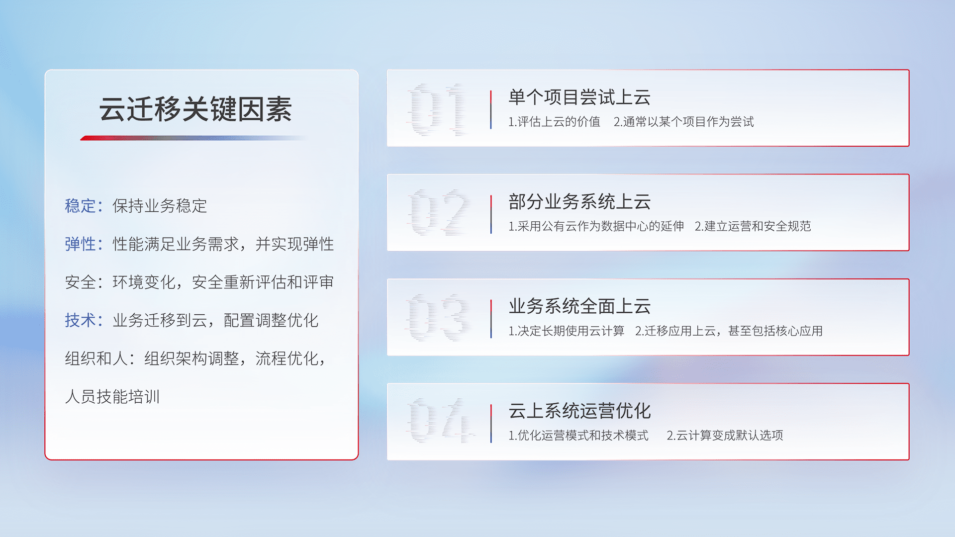 结合实际业务,,,从规划设计、、、云平台选型、、云原生改造、、、数据迁移、、集成交付,,,迁移全过程为客户识别最佳上云路径,,,做好风险识别管理,,,设计网络架构、、、身份权限、、安全审计合规、、、操作审计、、、日志审计、、、、监控告警策略、、、多站点容灾设计等,,,,对云上基础设施进行整体规划,,提升IT治理水平,,,以满足弹性、、高可用、、高性能的需求。。。。