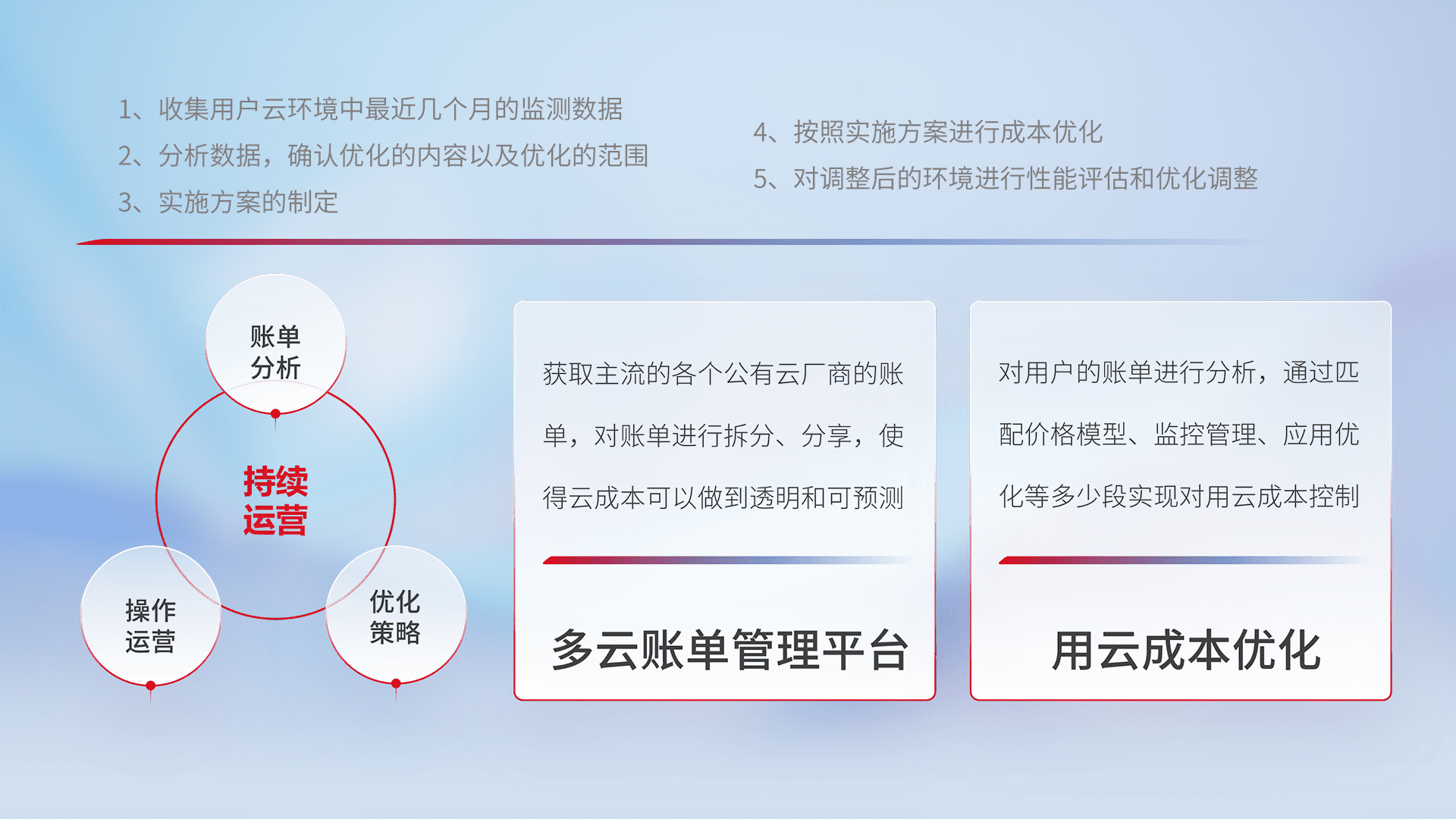 通过多云纳管,,以统一的资源数据模型把客户的云资源进行抽象和封装,,进而实现对多云资源的统一操作,,,,保障云资源管理的可靠性、、稳定性与可用性。。量身定制化运维内容,,配置、、、、开发运维、、补丁管理、、备份、、、监控、、、、认证和访问管理、、审计和日常巡检等,,保障在用云过程中的可靠度,,,稳定度以及高可用率。。。。